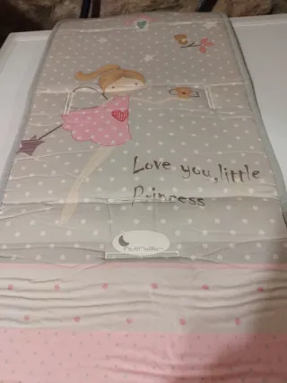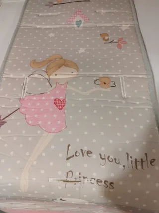 Funda acolchada para silla de cochecito con un dulce diseño de hada y pájaros. Ideal para añadir un toque tierno y proteger la silla. - Diseño estampado con hada, pájaros y estrellas. - Base gris con topos blancos. - Mensaje Love you, little Princess.