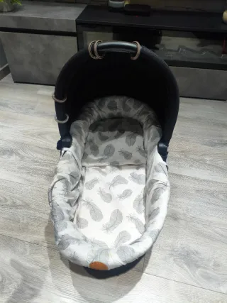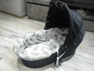 Capazo de bebé en color negro muy elegante, antimanchas y repelente al agua, ideal para los primeros meses. - Interior transpirable y acolchado para mayor comodidad. - Colchoncito con funda protectora desmontable y lavable. - Capota ajustable para proteger del sol. - Diseño moderno y funcional. - Incluye protectores antimosquitos y cubrelluvia. - Embalaje de origen.