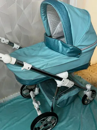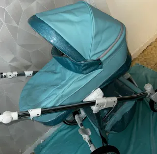 Carro de bebé en un llamativo color azul con detalles brillantes. Perfecto para paseos. - Capazo espacioso. - Capota ajustable. - Ruedas todoterreno. - Cesta inferior de gran capacidad. Regalo cambiador,protector de lluvia, funda para sillita y mosquitera.