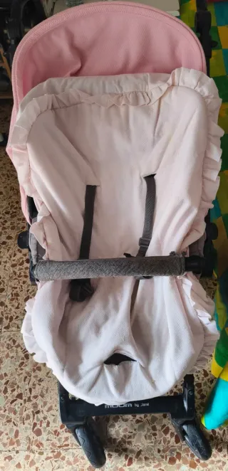 Carrito de bebé en color rosa, con capota y funda. - Capota con volantes. - Funda acolchada con cinturones de seguridad. - Barra frontal. - Marca: Jané. Se vende todo junto o separado. Escucho ofertas