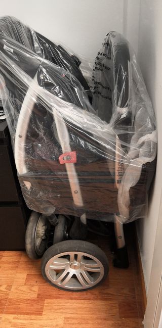 Carro de bebé PlayXtrem, no se puede plegar. Incluye varios accesorios para diferentes climas. - Funda de invierno. - Funda para la lluvia. - Parasol Regalo silla para mesa. Necesita una limpieza general.