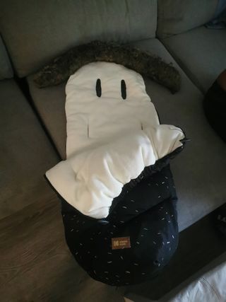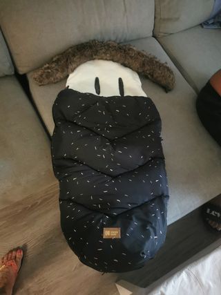 Preciosa funda para silla de paseo para invierno, en perfecto estado. - Color negro con detalles dorados. - Interior de borreguito blanco muy suave. - Capucha con pelo sintético marrón. - Ideal para abrigar al bebé en los meses más fríos.