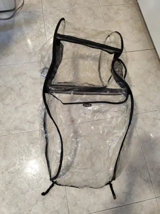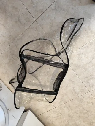 Funda de plástico transparente para proteger el cochecito de tu bebé de la lluvia y el viento. Diseñada para modelos Maclaren. - Material: Plástico transparente. - Borde con ribete negro.