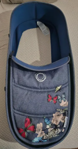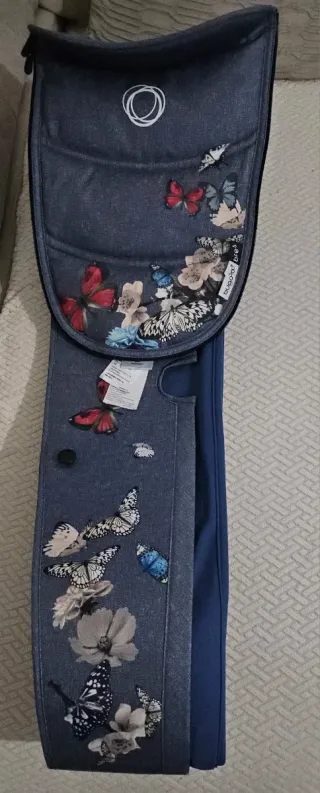 Funda para capazo Bugaboo Bee 5 con un bonito estampado de mariposas y flores. - Diseño de mariposas y flores. - Color azul denim.
