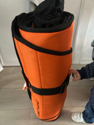 Funda de viaje para silla de paseo de bebé, modelo Stokke PramPack. Protege tu carrito durante los desplazamientos. - Color naranja y negro. - Incluye correas de sujeción y asa. - Material resistente.