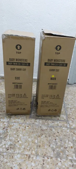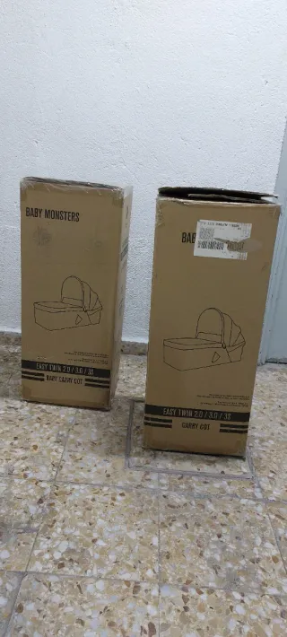 Dos capazos para carrito gemelar Baby Monsters. - Modelo: Easy Twin 2. - Color: Side. - Referencia: BMT30001. Están en muy buen estado y los doy con sus fundas para lluvia y la fundas a juego (carry cot lid). Lo entrego en Metro Prosperidad.