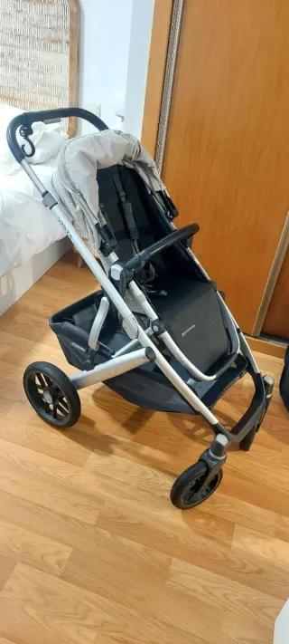 Carrito de bebé Uppa Baby modelo Vista 2, con capota de recién nacido y silla. - Chasis plateado. - Silla de paseo reversible. - Capota extensible. - Cesta de almacenamiento inferior tamaño xl(mucha más capacidad que lo standar en sillas) -Color beige con tono gris y verde.(para chico o chica) Capota de recién nacido solo usada 3 meses Ruedas traseras grandes Con 3 fundas de lluvia y 2 mosquiteras Chasis con algún arañazo,pero tiene muy buen estado de conservación. Se puede ver antes de comprar