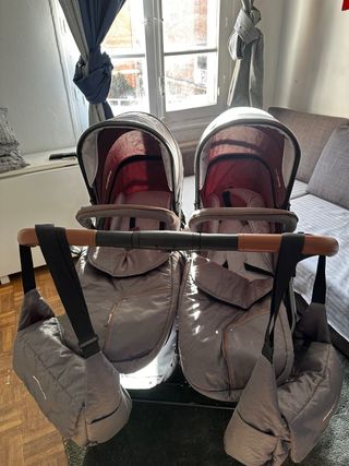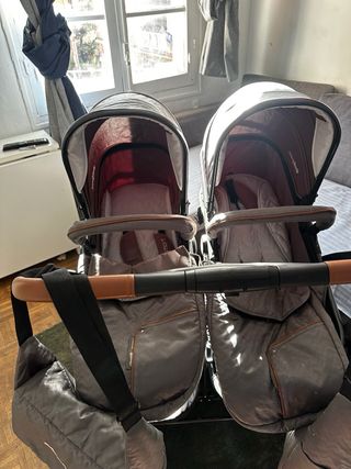 Carrito gemelar en buen estado, perfecto para hermanos que se llevan poco tiempo o gemelos. - Dos capotas independientes. - Fundas protectoras para las piernas. - Empuñadura acolchada.