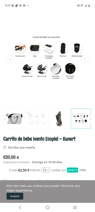 Carro de bebé Kunert Ivento Ecopiel en perfecto estado. Incluye varios accesorios para mayor comodidad. - Color: Ecopiel. - Incluye: Bolso, mosquitera, funda para lluvia, saco de invierno, cambiador, portavasos y cinturón de seguridad. Esta perfecto