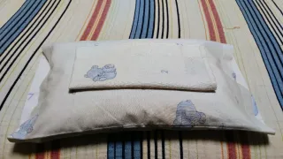 Set de almohada y dos fundas, para cuna o minicuna. - Almohada rellena de esponja y dispone de cremallera. - Una funda con estampado de elefantes azules y números. - Otra funda con estampado de ositos rojos claros. Medidas: - Almohada 25x35 cm. - Fundas 25×45 cm. Hago envíos por Wallapop. La entrega en mano es en mi ubicación.
