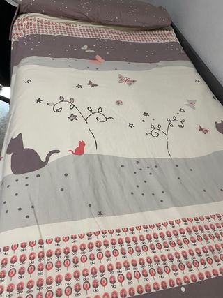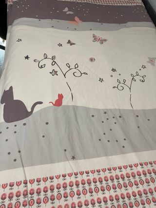 Funda nórdica con un adorable diseño de gatito mas una funda de almohada a juego. -Se puede utilizar como colcha de primavera verano. -Cierre con cremallera. De 2 metros por 1.33. - Estampado de gatito con ojos azules. - Incluye funda de almohada a juego.