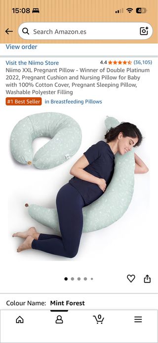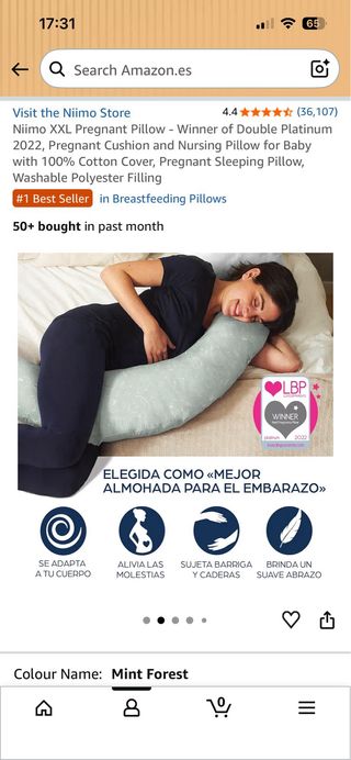 Almohada de maternidad Niimo XXL en color Mint Forest. Diseñada para ofrecer comodidad durante el embarazo y la lactancia. - Funda 100% algodón. - Relleno de poliéster lavable. - Ganadora de Doble Platino 2022.