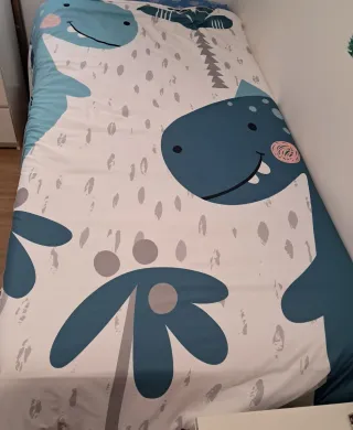Conjunto de ropa de cama con funda nordica funda almohada visillos y cortinas con el mismo divertido estampado de dinosaurios. Se puede vender junto o separado. Conjunto completo 35 euros - Funda nórdica y almohadas 15 euros - Cortinas. 15 euros - Visillos. 10 euros