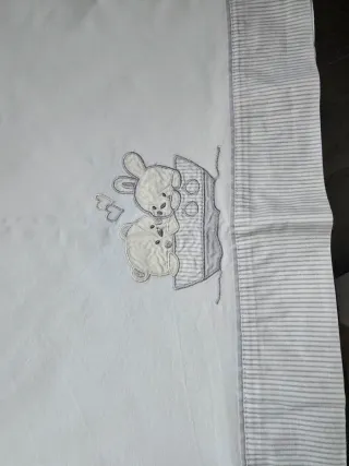 Conjunto de ropa de cuna para bebé. - Incluye nórdico, funda y almohada. - Diseño con pequeños topos grises sobre fondo blanco. - Tejido de algodón. - Es de Ikea todo. Está nuevo, usado en pequeñas ocasiones pues no duerme en la cuna. Si quieres más fotos, vídeos escribe y te muestro está en perfecto estado.