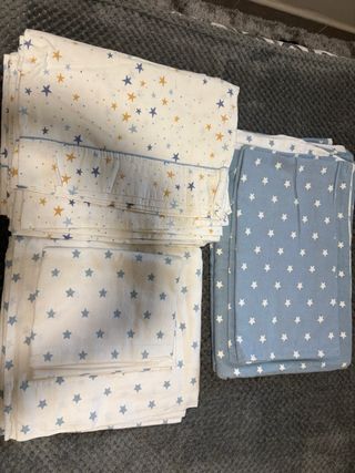 1 edredón nórdico cuna 1 almohada cuna 2 juegos de funda nórdica completos( funda + bajera + funda almohada) 2 juegos con dos piezas(funda +funda almohada) Tengo una bajer blanca a lavar de uno de ellos porque tenía una mancha si sale también la mando y serían 3 completos