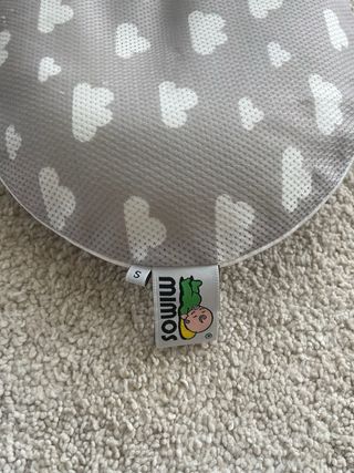 Almohada para bebé de la marca Mimos, talla S, diseñada para ofrecer comodidad y soporte. - Se regala funda con estampado de nubes. - Color gris y blanco. - Etiqueta de la marca visible. Recomendada por pediatras