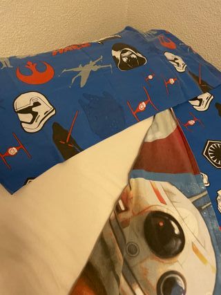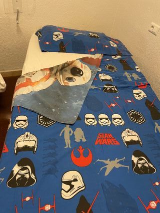 2 Juegos de fundas nórdicas de Star Wars para cama de 90 cm 2 juegos de tres piezas cada uno (bajera + funda nórdica reversible + funda almohada). Son reversibles. Están en perfectas condiciones