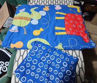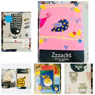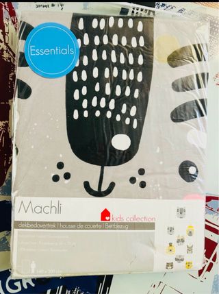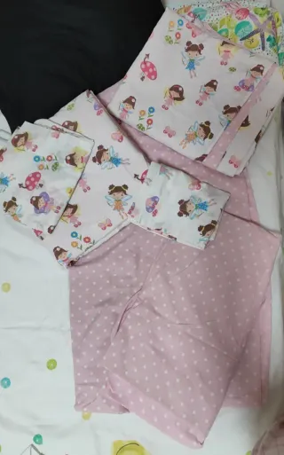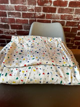 Conjunto de sábanas para cama infantil con un divertido estampado. - Diseño con múltiples formas de colores sobre fondo blanco. - Incluye sábana bajera, funda de almohada y funda de edredon Dispongo de 2 sets iguales, precio unitario por set 10 eur, precio para los dos 16 eur