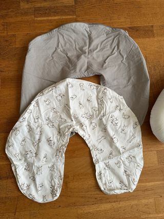 Almohada de lactancia con su funda gris y una extra de conejitos. Medidas 60x50x18 cm