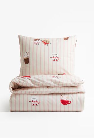 Juego de cama infantil para cama de 90 cm, completamente nuevo a estrenar. - Diseño con rayas rosas y blancas. - Estampado de figuras infantiles. - Incluye funda de almohada y funda nordica
