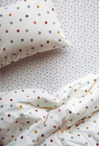 Conjunto de ropa de cama infantil con un divertido estampado de lunares de colores. Ideal para camas de 90 cm. - Diseño de lunares multicolor sobre fondo blanco. - Incluye bajera, funda de almohada y funda nórdica. - Tejido suave y agradable al tacto. - A estrenar, en su embalaje original.