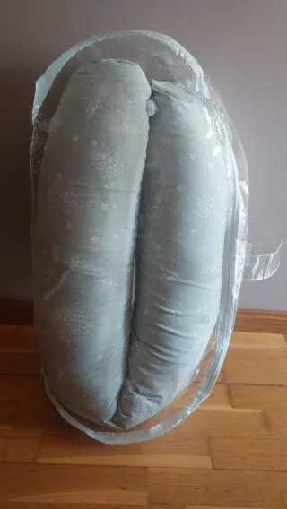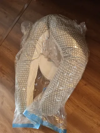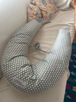 Uso durante embarazo y lactancia de mi bebé. Comprada nueva. La funda se puede lavar. De regalo Sophie la giraffe (porque tengo más de una 😅) Almohada de lactancia y embarazo de la marca Koala Babycare. Su diseño en forma de U es muy práctico. - Funda gris con estampado de lunares blancos. - Cierre con cremallera. - Incluye una cinta para atarla.