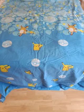 Funda nórdica reversible con diseño de Pokémon para cama de 90 cm. Presenta a Pikachu y el logo de Pokémon. Es reversible, en un lado tiene el dibujo en grande y por el otro en pequeños - Diseño de Pikachu. - Logo de Pokémon. - Fondo azul con estrellas y líneas. - Incluye bajera y almohada. - La conga es de calidad y larga para que no se salga y cubra bien.