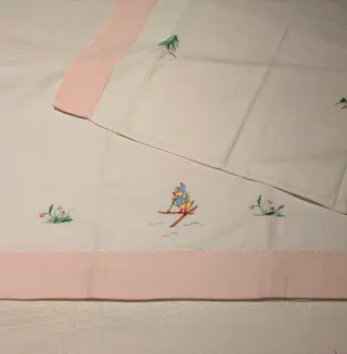 Conjunto de sábanas y funda de almohada para cuna con un encantador diseño bordado. - Sábana blanca de algodón - Funda de almohada a juego - Con entredos - Bordados de patito esquiador y motivos de montaña. Ideal como cortina estor para habitación infantil. Medidad sábana: 75x120 cm.