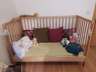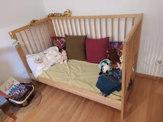 Cuna/cama evolutiva de madera, de 0 a 4 años, con 3 posiciones: cuna alta (hasta 6 meses), cuna baja (hasta 1,5 años) y cama baja (hasta 3,5 - 4 años), quitando una barra lateral. - Estructura de madera clara. - Barrera de seguridad. - Incluye colchón, protector de colchón, 2 juegos de sábanas bajeras, almohada y 2 fundas de almohada Medidas: 123x66 cm.