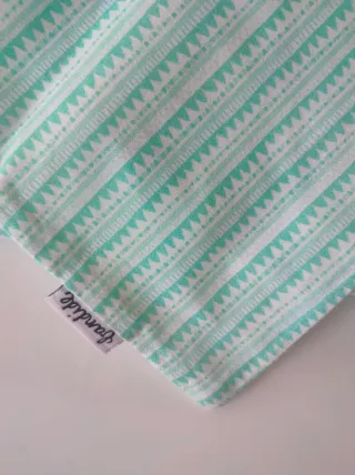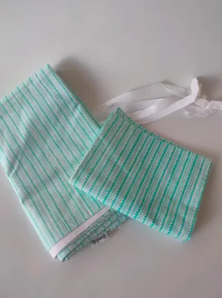 Juego de funda nórdica y funda de almohada para cuna con un bonito estampado.De la marca Bandide.Nuevo a estrenar. Se cierra con cintas. Tamaño 124 x 112 cms y funda almohada medida 55x 37 cms. - Diseño con rayas y triángulos en tonos menta y blanco. - Incluye cintas para atar.