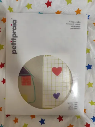 Funda nórdica de la marca Petit Praia con un diseño infantil. - Estampado de casa y corazones. - Material: 100% algodón. - Incluye funda nórdica, funda de almohada y bajera. - Con motivos bordados -Parte final de la funda nórdica en disminución/fora de embudo para que no se salga (foto 4) - Nueva a estrenar