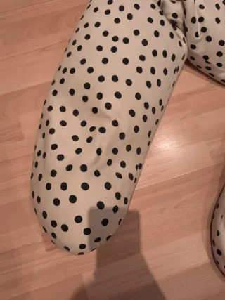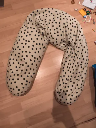 Almohada de lactancia y embarazo con un diseño de lunares grises. - Funda con estampado de lunares blancos sobre fondo gris. - Forma ergonómica para mayor comodidad. - tiene un pequeño descosido.