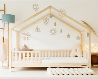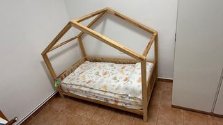 Cama infantil con estructura de madera en forma de casita. Ideal para crear un espacio de juego y descanso. Las medidas son 90x160, ideal como primera cama. - Estructura de madera natural. - Diseño de casita. Incluye: - Colchón Ecus care - Funda nórdica tipo saco con estampado de dinosaurios - Relleno nórdico 4 estaciones - Protector de colchón - Almohada Tanto la cama como el colchón están en muy buen estado ya que no ha dormido en ella, preferiría la cama de los papis. El único desperfecto que tiene es que se levantó un poquito de madera, se ve en la última foto. Esa parte de la cama es la que queda contra la pared y no se ve.