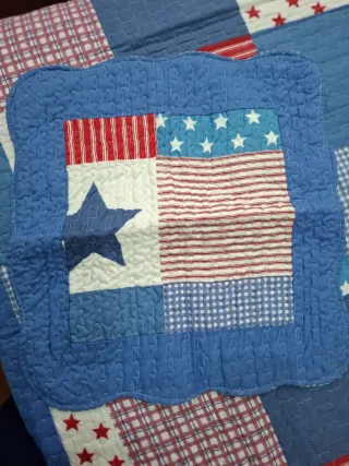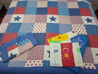 Para cama infantil de 90: COLCHA / EDREDÓN con estampado estilo patchwork y funda de cojin a juego. Apenas sin uso, excelente estado!!! REGALO Conjunto de sábanas compuesto por encimera, bajera y almohada.