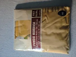 Funda nórdica y funda de almohada a juego, en color beige con detalles de rayas doradas. - Funda nórdica: 150 x 200 cm. - Funda de almohada: 45 x 105 cm. - PVP: 10,99 €.