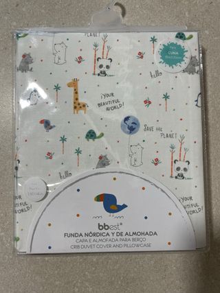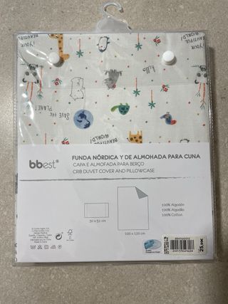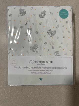 A ESTRENAR - Funda nórdica reversible y funda de almohada para cuna de la marca Cotton Juice (El Corte Inglés) - Material: 100% Algodón. - Medidas funda nórdica: 100 x 120 cm. - Medidas funda almohada: 30 x 51 cm. - Diseño reversible.