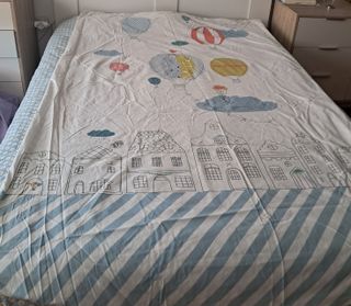 Funda nórdica infantil con un divertido diseño de globos aerostáticos y casitas. -120x190 - Estampado de globos y casas. - Borde inferior con rayas azules y blancas. - 2 fundads de almohadón 60x55 - Todo reversible