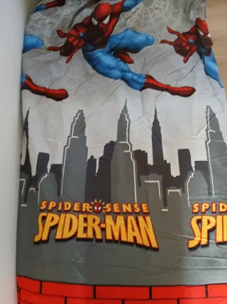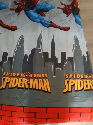 Funda nórdica con diseño de Spiderman y siluetas de edificios.Uncluye funda para relleno y de almohada - Ilustración de Spiderman en acción. - Fondo de ciudad con rascacielos. - Borde inferior con diseño de ladrillos rojos.