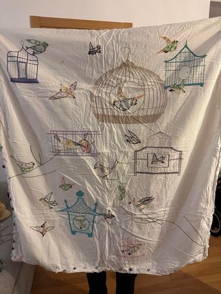 Funda nórdica para cuna de Zara Home con un bonito estampado de pájaros y jaulas. Incluye cubre almohada Medidas: 100x120cm - Acabado con pompones de colores en los bordes.