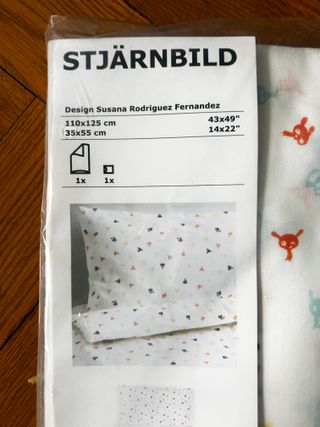 Juego de funda nórdica y funda de almohada STJÄRNBILD de IKEA. El diseño presenta un estampado divertido de pequeños personajes. Nuevo, nunca se ha usado - Funda nórdica: 110x125 cm - Funda de almohada: 35x55 cm