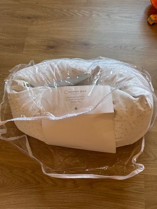 Almohada de lactancia de la marca Cotton Juice, con un diseño de estrellas grises sobre fondo blanco. Viene en su embalaje original. - Diseño de estrellas. - Marca: Cotton Juice. - Incluye funda.