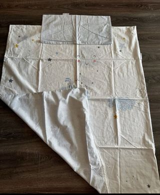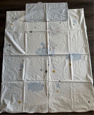 Funda nórdica para maxicuna con un bonito diseño de nubes y estrellas. - Medidas: 70x140cm. - Composición: 90% algodón, 10% poliéster. - Funda de almohada de regalo. - Cremallera. - Sin manchas y en muy buen estado. ¡Mira más productos de mi perfil!