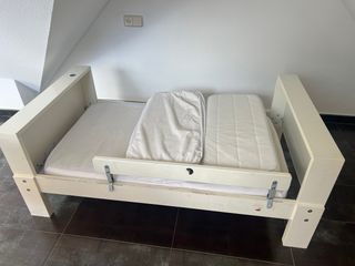 Cuna ikea completa Dos alturas 125 largo 67 ancha 85 alto 1 almohada Protector colchón 2 1 edredón Dos protectores barrera 4 juegos fundas nórdicos completos Almohadas Sábanas bajeras Barrera protectora para cuando se quite el lateral Aunque en la foto no salga también esta el otro lateral Perfeto estado