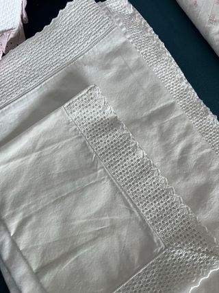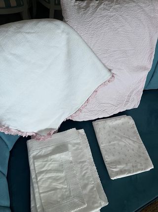 Ropa de cuna de 60 x 120 cm. Se encuentra prácticamente sin uso. Limpio, cuidado y sin manchas ni rotos. Mis hijos han dormido siempre encima y no se tapaban. - Manta de borreguito, 90 x 120 - Dos juegos de sabanas de verano, incluye bajera, encimera y funda de almohada -Un juego de sabanas de invierno, incluye bajera, encimera y funda de almohada - Dos sabanas bajeras adicionales blancas - Una funda de colchón impermeable -Una funda de colchón de rizo para el invierno