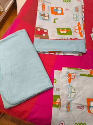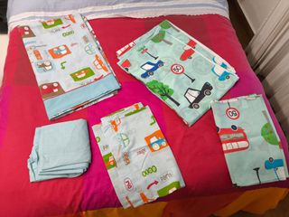 🛏️ Juego de Sábanas + Conjunto de Funda Nórdica Infantil · Coches y señales · 5 piezas. ropa de cama infantil con diseños de coches, señales de tráfico y colores alegres. 🚗 Incluye: Juego de sábanas formado por Sábana bajera (azul claro), Sábana encimera con estampado de coches y Funda de almohada a juego, y también Conjunto nórdico formado por Funda nórdica (dos diseños diferentes: señales de tráfico y coches) y Funda de almohada a juego. Para cama de 90 cm. ⭐ Estado: poquísimo uso (conserva el aprestro de una sábana nueva). Tejido suave y colores vivos. Todo limpio, sin manchas ni rotos. ✨ Estado impecable, como nuevo. 📸 Las f