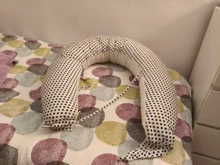 Cojín versátil para lactancia y embarazo, también útil como nido para bebé. Su diseño ergonómico ofrece soporte y comodidad como almohada a la embarazada y posteriormente para la lactancia. Gracias a sus cremalleras laterales se puede cerrar tipo nido para dejar al bebé descansar en sus primeros meses. Marca Dilamababy. Incluye funda con estampado de topos blancos sobre fondo beige. En perfecto estado, solo dañado el broche como se aprecia en la última foto.