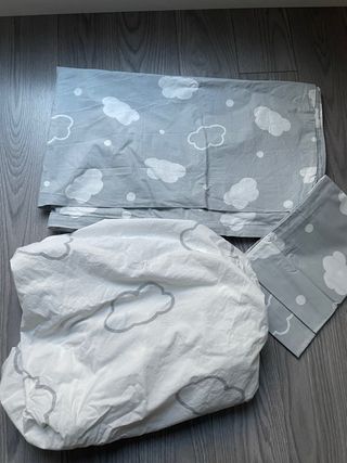 Conjunto de ropa de cuna para bebé. - Incluye nórdico, funda y almohada. - Diseño con pequeños topos grises sobre fondo blanco. - Tejido de algodón. - Es de Ikea todo. Está nuevo, usado en pequeñas ocasiones pues no duerme en la cuna. Si quieres más fotos, vídeos escribe y te muestro está en perfecto estado.