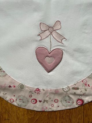Juego de sábanas para moisés o capazo con un bonito diseño. - Tejido blanco suave. - Borde decorado con estampado floral y corazones. - Incluye un detalle bordado de un corazón con un lazo.