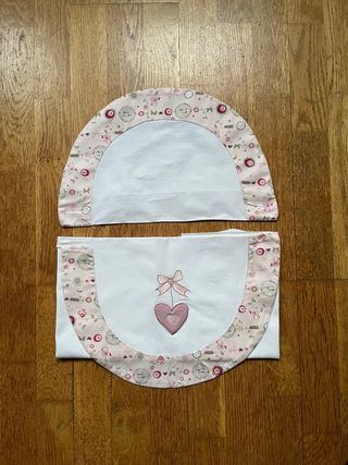 - 4 sábanas encimeras de 90×1'50 con sus fundas de almohadas. - 3 toallas, una de ellas con capucha. - 3 arrullos, dos abiertos y uno cerrado. - 2 cambiadores. - 1 funda para meter los paquetes de toallitas. Todo realizado a mano excepto la sábana de ositos. Incluye un porta biberones para el cochecito y dos pares de zapatos de bebé.