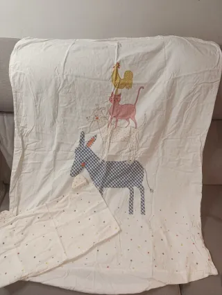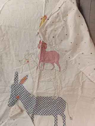 Funda nórdica para cuna de Zara Home con un divertido estampado de animales. Reversible. Incluye la funda para el nórdico y la funda ade almohada. Para cunas de 120x60 cm